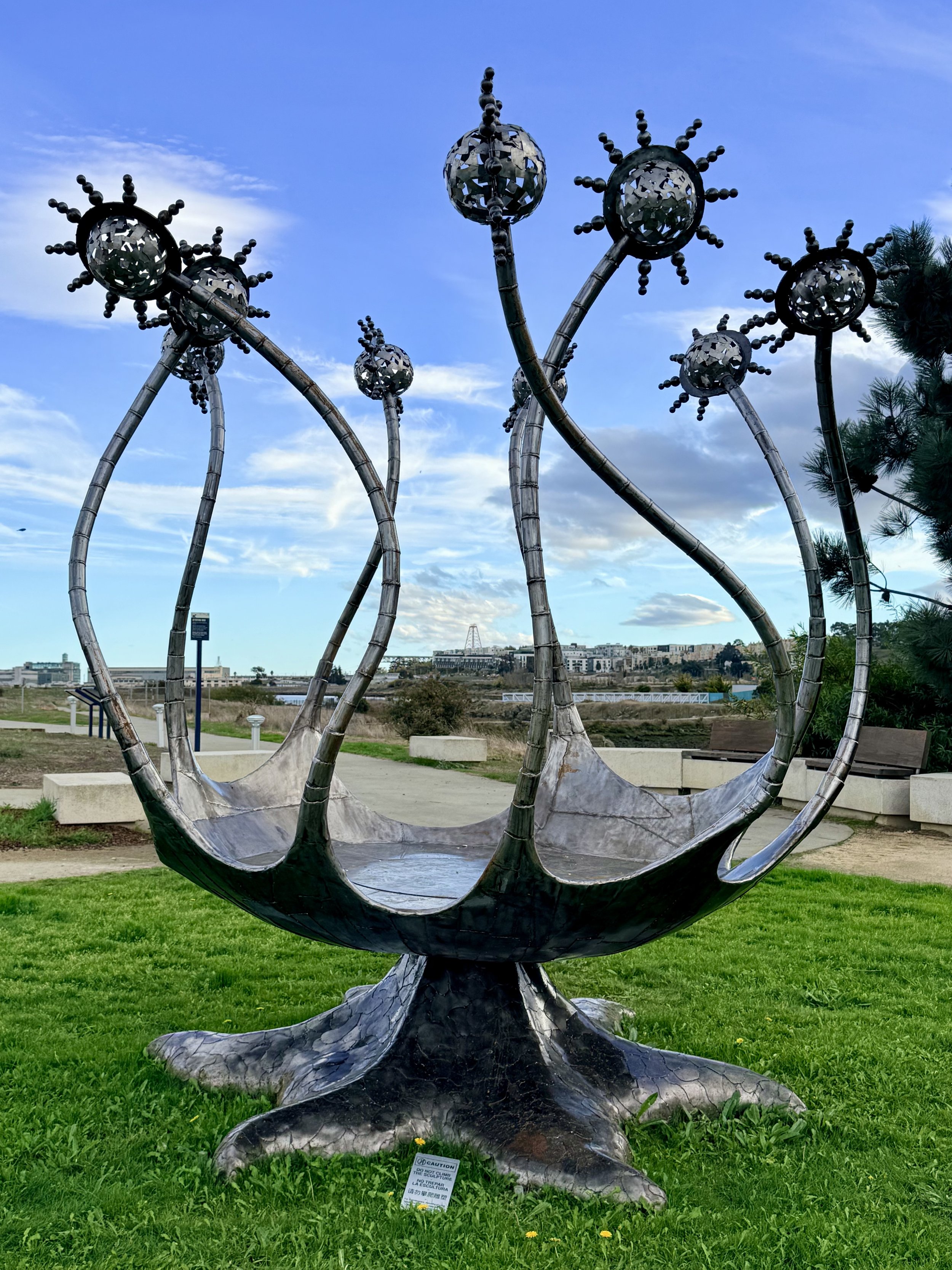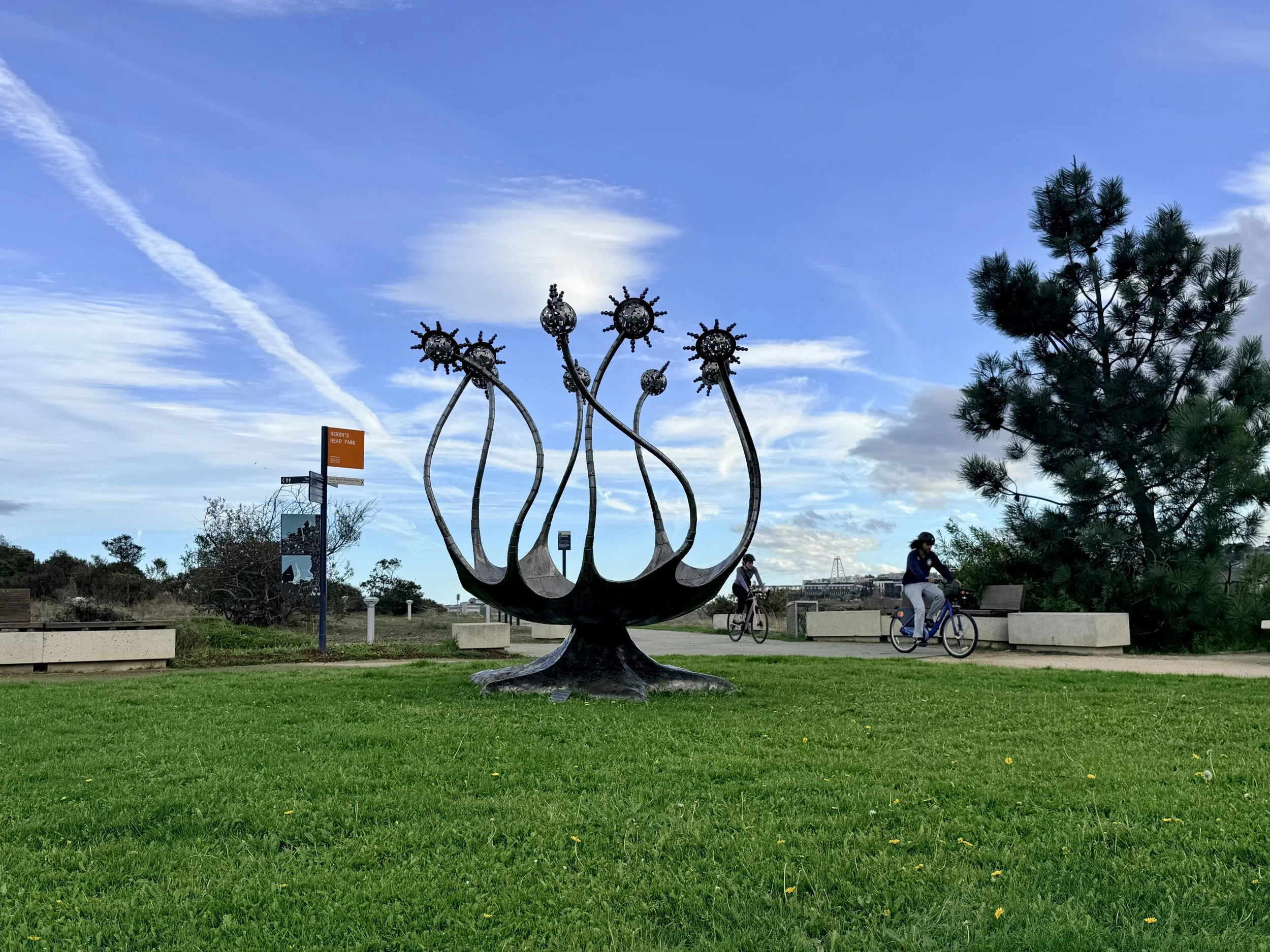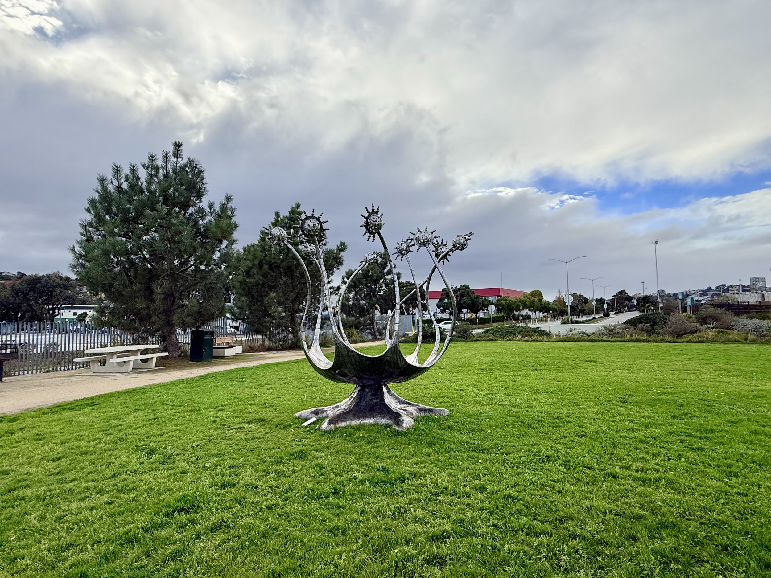 Bloom is a striking sculpture by Bay Area artist Michael Christian, to be installed at Heron’s Head Park in San Francisco. Known for his intricate and imaginative steel creations, Christian designed Bloom to invite curiosity and engagement from all angles. The sculpture will be securely anchored to the ground, ensuring stability in the park’s open and often windy waterfront setting.