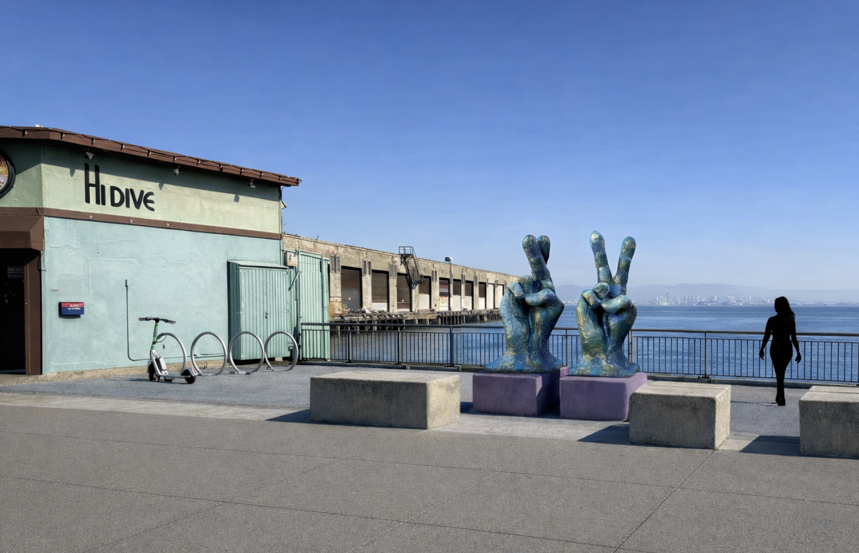 Positioned along the Embarcadero, Hope / Peace enters into dialogue with the movement of the waterfront and the diversity of the city. The paired forms suggest duality and balance, holding space for both reflection and possibility.