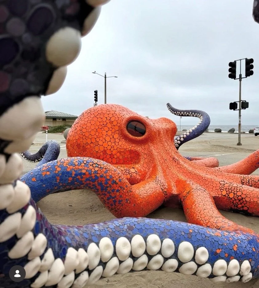 Octavius, a 7-foot-tall, 24-foot-wide, and 30-foot-long octopus sculpture by artist Peter Hazel, is a vibrant celebration of marine life and human craftsmanship. Adorned with thousands of handmade and painted mosaics—with no cuts, each edge high-fired to vitrify the clay—the piece is exceptionally resistant to weather, ensuring water cannot penetrate the ceramics. Its fused glass suction cups and eyes enhance both its lifelike and fantastical qualities, inviting viewers to marvel at the wonders of the sea.