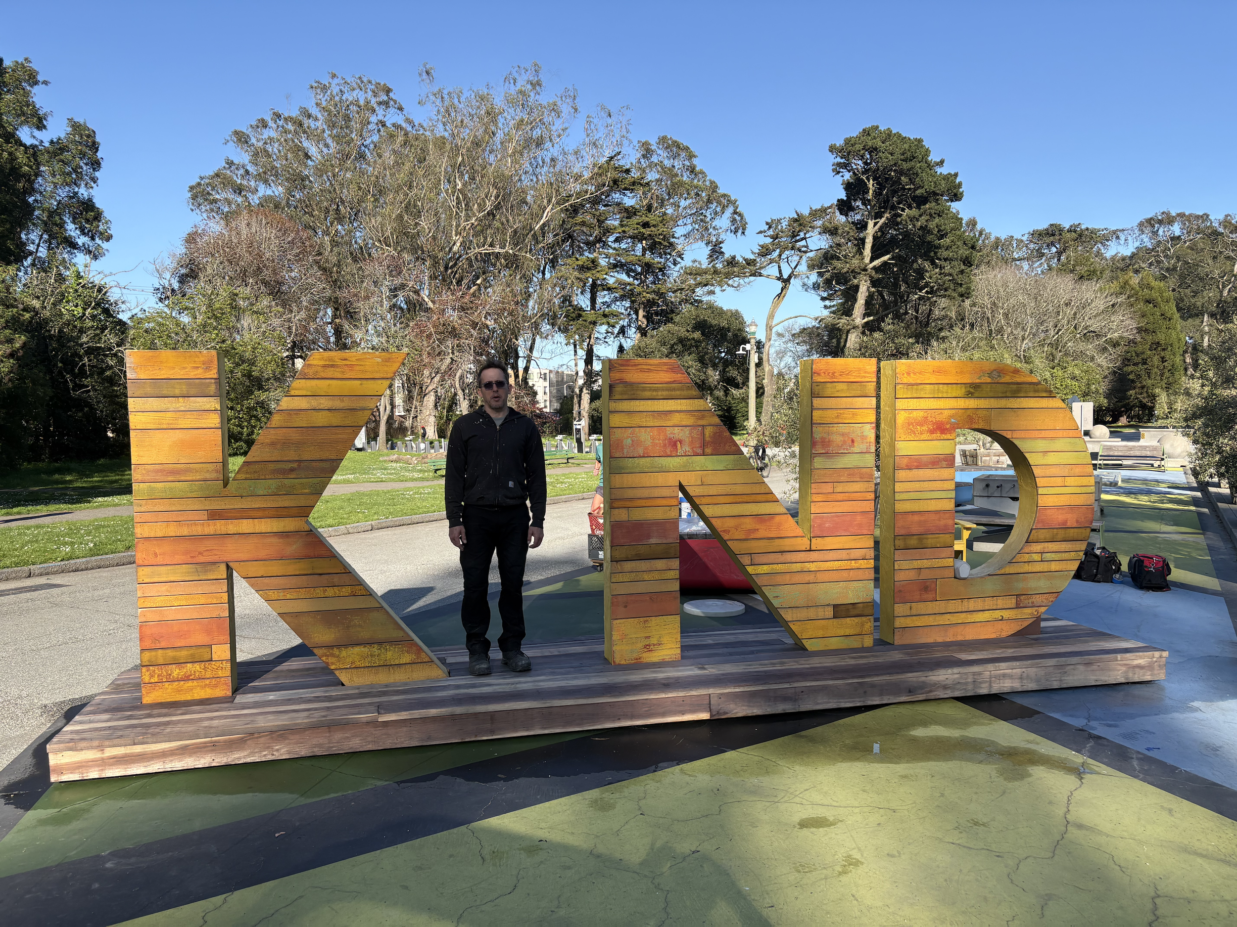 The "i" is missing: A human figure standing in the designated space completes the spelling, turning the sculpture into a moment of personal connection and fun.