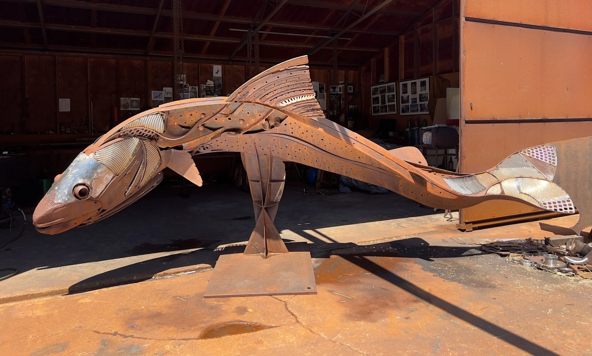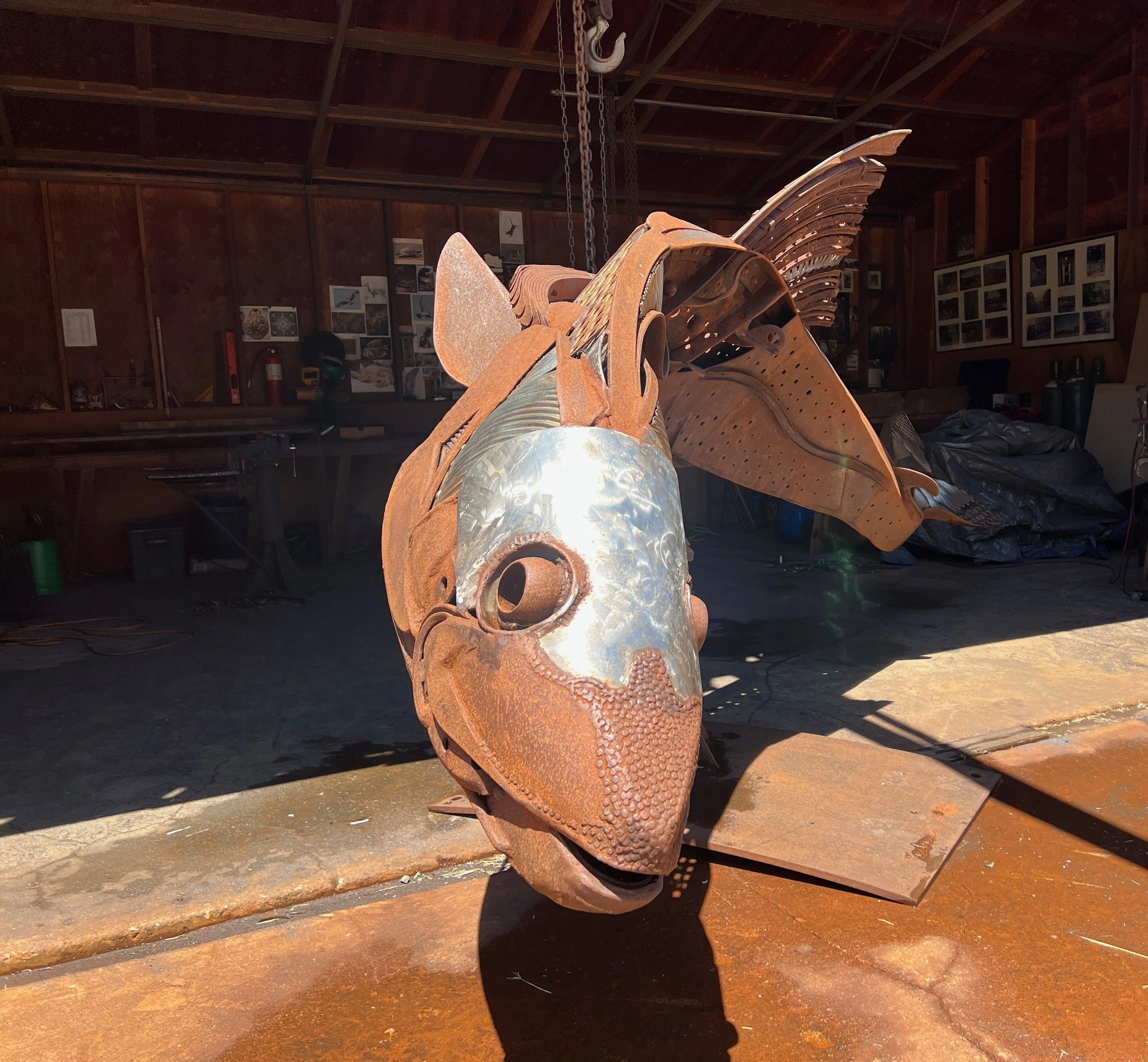 In 2019, Soda Rock Winery, located near Healdsburg, CA, tragically burned to the ground, leaving a pile of melted glass and tangled steel beams. Out of this mess, owner Ken Wilson and I salvaged four primary beams that now formed graceful curved arcs with a slight twist, hoping to turn them into something sculptural. The winery is situated along the Russian River, which inspired the creation of a fish