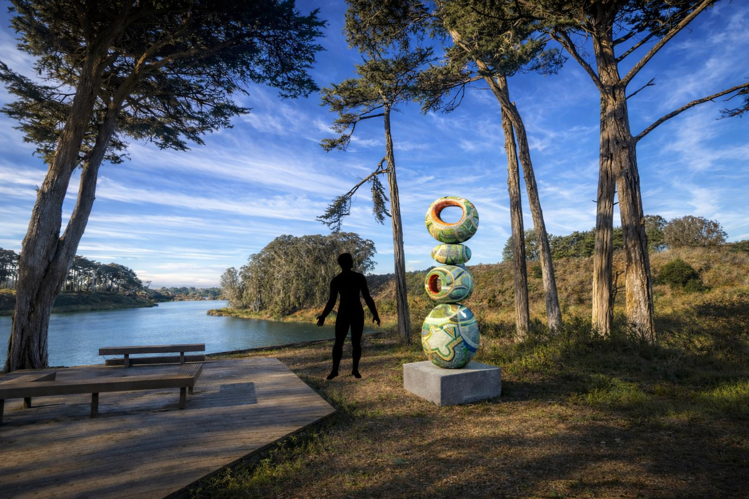 Set at the Lake Merced overlook, VLeB engages in a quiet dialogue with water, wind, and sky. Its stacked, rounded forms echo the organic rhythms of the landscape, rising gently among the cypress trees.